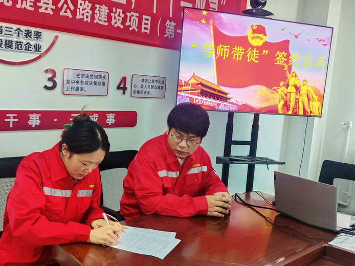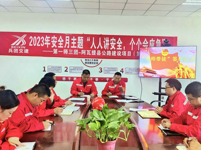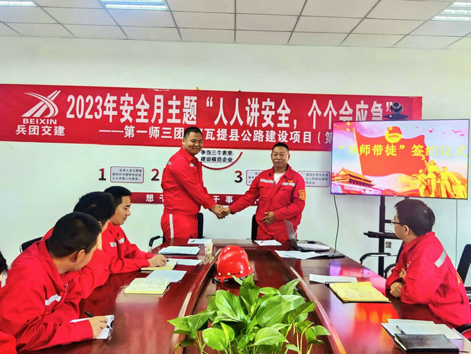 為幫助新進員工適應崗位,融入工作,盡早成長為企業(yè)發(fā)展的骨干人才,7月14日,兵團交建第一師三團-阿瓦提縣公路項目第一合同段開展了“傳承匠心 攜手共進”導師帶徒簽訂儀式,3名青年職工與各自的導師簽訂了《導師帶徒協(xié)議書》,結(jié)成“傳、幫、帶”對子。