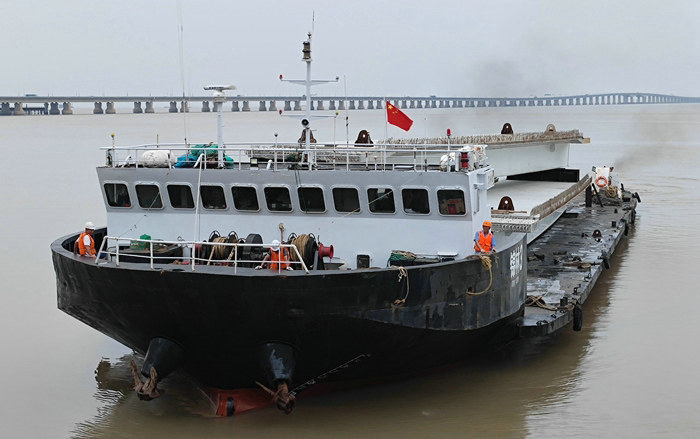 濱海互通所需鋼混疊合梁在舟山制造,因超長超寬、安全隱患多、從甬舟高速只運輸一車6片梁便叫停,改由船舶運輸至濱?;ネㄊ┕がF(xiàn)場。為保證運梁通航安全,寧波海事局專門派人勘察線路,進(jìn)一步縮短運梁距離。在鋼混疊合梁運輸過程中,海事局及時發(fā)布海況、天氣等信息,運梁避開大風(fēng)大浪天氣,為海運安全上了一道安全屏障。截止7月23日,經(jīng)海上運輸?shù)?3船、464片鋼混疊合梁全部由舟山安全抵達(dá)濱?;ネǎ?月25日將完成濱?;ネㄗ詈笠黄旱募茉O(shè)。