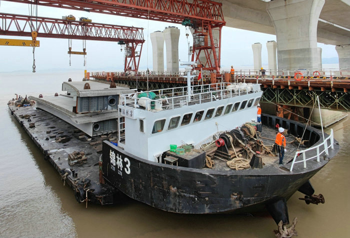 鐵路工程建設(shè)網(wǎng)訊(通訊員彭勇 呂奎元)7月23日下午,隨著寧波海事局護(hù)航的一艘裝載著30米長、3片170噸鋼混疊合梁的貨船駛進(jìn)杭甬復(fù)線寧波一期濱?;ネǜ鄢?,從海上運輸?shù)?64片梁全部完成。
