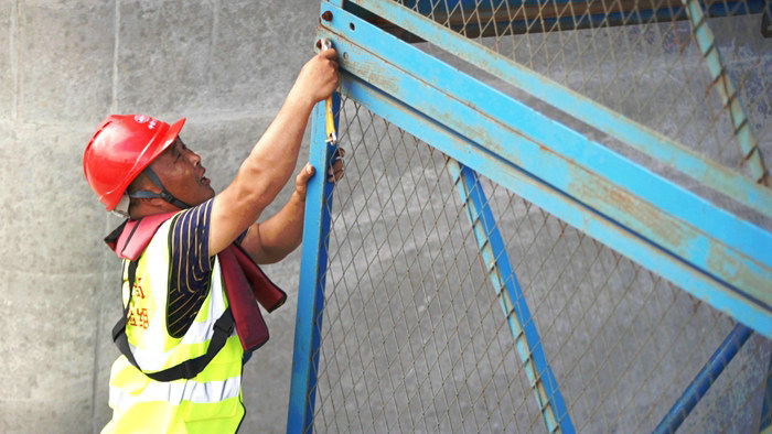 安全員張金華在加固梯籠 呂奎元攝