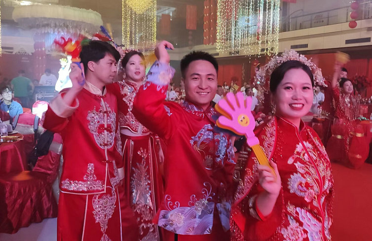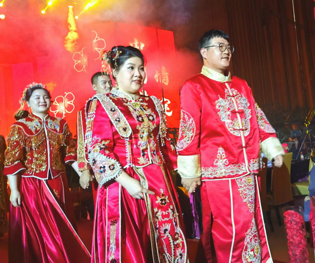 上午8時(shí),來(lái)自該公司管內(nèi)施工生產(chǎn)一線的8對(duì)新人,脫下一身工裝換上新婚禮服,在父母親友和領(lǐng)導(dǎo)同事的見(jiàn)證下,雙雙跨火盆、邁馬鞍等儀式,步入新婚的殿堂。通過(guò)行結(jié)發(fā)禮、執(zhí)手禮、合巹禮、三拜禮,盛裝開(kāi)啟人生的美好征程。