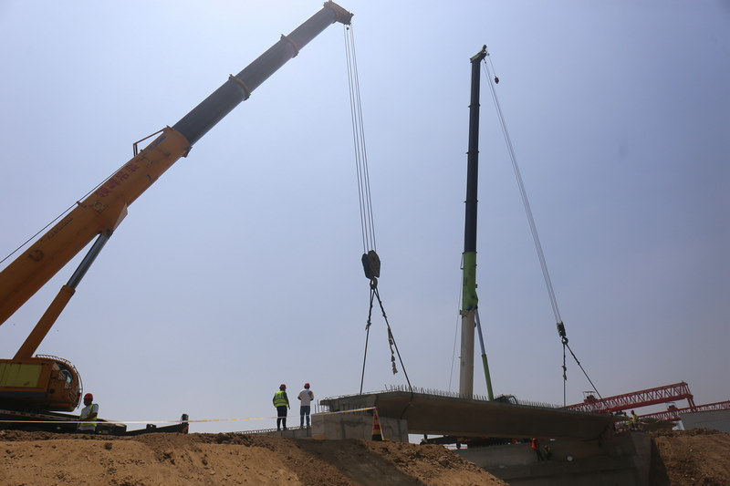 為確保首片箱梁順利架設(shè),項目部始終堅持“方案先行、過程管控、安全質(zhì)量可控”的施工原則,反復(fù)研討施工方案,多次組織開展箱梁運輸、箱梁架設(shè)過程推演,從吊裝、運輸、架設(shè)等多個環(huán)節(jié)進(jìn)行周密部署,確保質(zhì)量、安全可控,確定最終施工方案。施工前,項目部科學(xué)統(tǒng)籌配置機(jī)械設(shè)備,施工作業(yè)人員,對施工班組及吊裝人員進(jìn)行系統(tǒng)的施工作業(yè)技術(shù)交底和安全培訓(xùn)。架設(shè)過程中,為有效加強(qiáng)施工現(xiàn)場的過程控制,嚴(yán)格按照施工規(guī)范、質(zhì)量安全體系標(biāo)準(zhǔn)對提、運、架等關(guān)鍵工序?qū)訉影殃P(guān),進(jìn)一步提高吊裝效率。同時,現(xiàn)場技術(shù)人員聯(lián)合測量人員同步測算,施工作業(yè)人員與吊裝人員密切配合,確保箱梁架設(shè)過程順利進(jìn)行,保質(zhì)保量完成首片箱梁的成功架設(shè)。