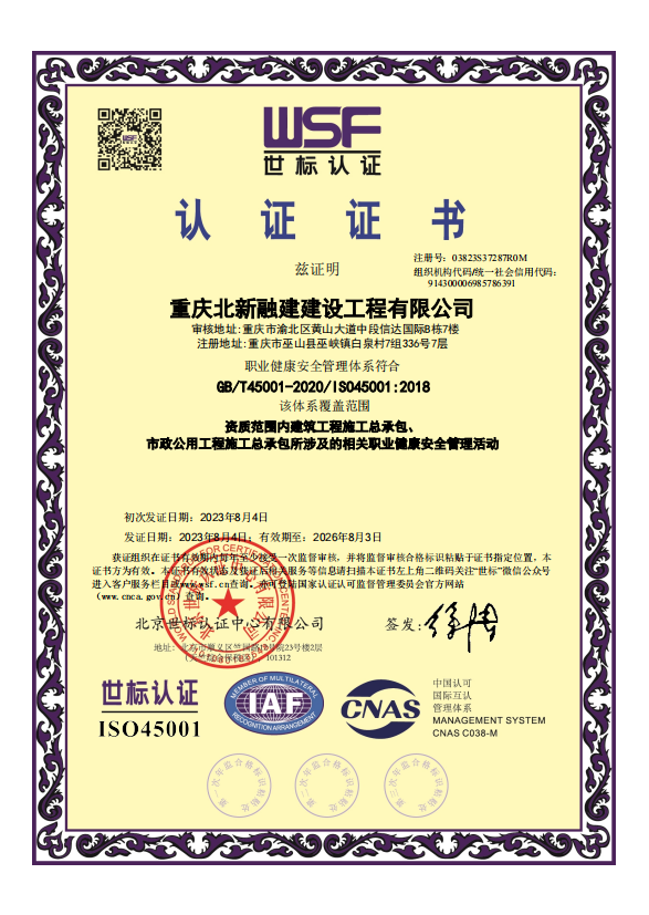 重慶訊 近日,北新融建公司順利通過了北京世標認證中心ISO體系認證審核,取得ISO9001質(zhì)量管理體系認證、ISO14001環(huán)境管理體系認證、ISO45001職業(yè)健康安全管理體系認證三項證書。