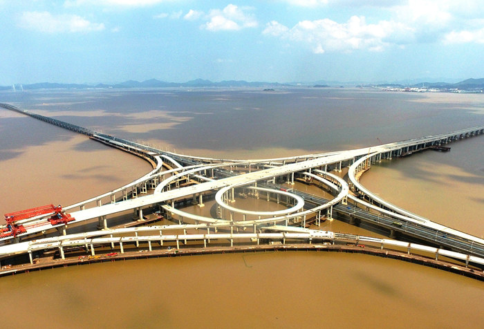 濱?;ネㄈL9705米,由1座主線、4座拼寬、8座匝道組成,設(shè)樁基1027根、169座承臺、636座橋墩、232跨470片鋼混疊合梁。2021年初開工以來,該集團(tuán)克服新冠疫情、4次臺風(fēng)襲擊帶來的不利因素,主線棧橋順利下穿金塘大橋,安全跨越海底盾構(gòu)隧道、原油管道、電纜等多條管線,排除了潛伏在海底的“定時(shí)炸彈”。同時(shí),積極優(yōu)化施工方案,破解了海下泥巖、碎巖等給鋼護(hù)筒打插、鉆孔造成的難題,為樁基施工清楚了障礙。