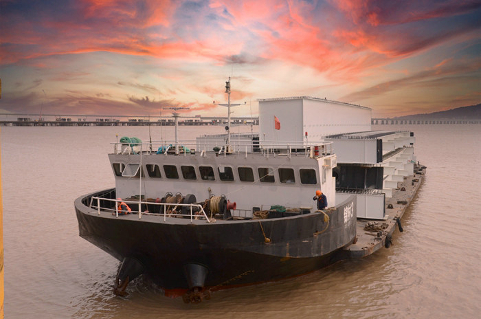 在生產(chǎn)梁過程中,他們選擇加工制作力量雄厚的舟山一家鋼結(jié)構(gòu)廠,并派人駐廠監(jiān)督指導(dǎo),保證了進(jìn)度、安全和質(zhì)量。為保證濱海互通工期,該公司采取具備架梁條件的匝道,啟用兩臺履帶吊架梁,與承臺、墩身施工同步。在運(yùn)梁時(shí),先從公路運(yùn)輸,因安全風(fēng)險(xiǎn)大,改為海上運(yùn)輸,在石化區(qū)碼頭卸梁,然后裝大卡車轉(zhuǎn)運(yùn)到現(xiàn)場。這個(gè)運(yùn)梁方案經(jīng)過實(shí)踐,有距離遠(yuǎn)、費(fèi)用高、路途不安全等弊端。經(jīng)過反復(fù)研究,最后決定在濱海互通南端建1座卸梁站、2座提梁站,開辟了由舟山直通工地的航線,費(fèi)用大大縮減,提高工效2倍多。