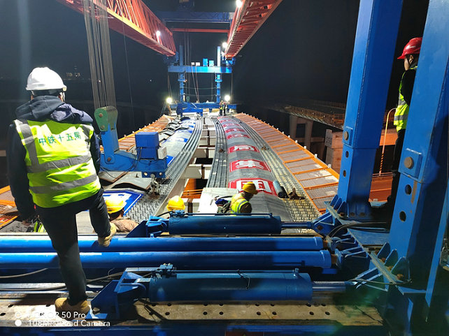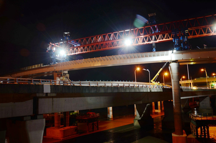 4月份,該項目部組織開展“90天六比六創(chuàng).鐵建杯”勞動競賽,將全員的智慧和力量凝聚到項目的安全質(zhì)量和進度上來。隨著濱?;ネㄐ读赫竞吞崃赫镜慕ǔ?,由舟山曲線海運鋼混疊合梁改為直達(dá)濱海互通現(xiàn)場,架梁進度大大加快。4月7日濱?;ネㄆ磳挊虻谝黄摶殳B合梁架設(shè)成功、27日F匝道架梁順利上跨金堂大橋、5月28日和6月8日第4和第5座匝道架梁相繼完成。6月27日2號拼寬橋右幅與金塘大橋相接、6月25日A、D匝道架梁成功上跨金塘大橋,消除了濱?;ネㄗ畲蟮陌踩L(fēng)險。
