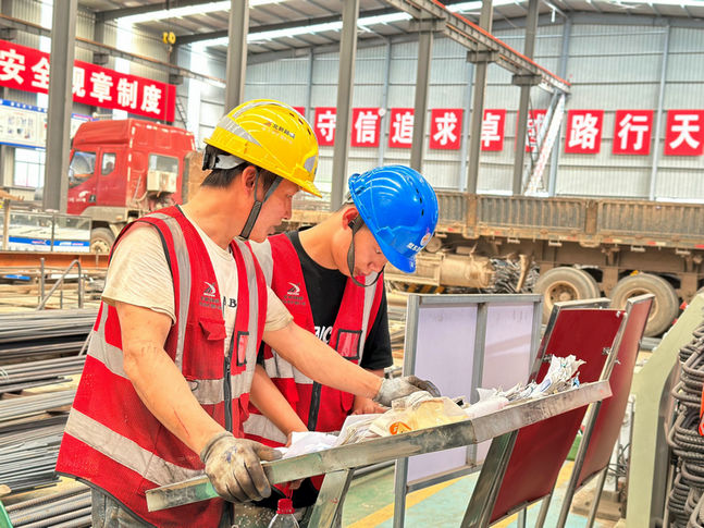 圖為:北新路橋集團(tuán)長(zhǎng)沙分公司戶口B1標(biāo)項(xiàng)目施工員和一線工人交流研討 盧仕磊 攝