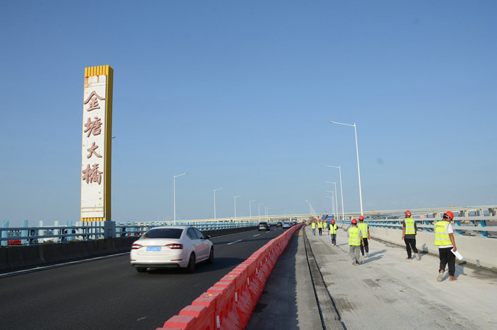 拼寬橋預(yù)制板與金塘大橋拼接完成后,進(jìn)行防撞護(hù)欄施工,最后一道工序是拆除金塘大橋護(hù)欄,擺放水馬進(jìn)行臨時(shí)安全防護(hù),對(duì)既有公路大橋銜接部分進(jìn)行切割,并與拼寬路面一并進(jìn)行“銑刨”,增加瀝青與混凝土層的粘合力,使路面形成一個(gè)整體受力面。