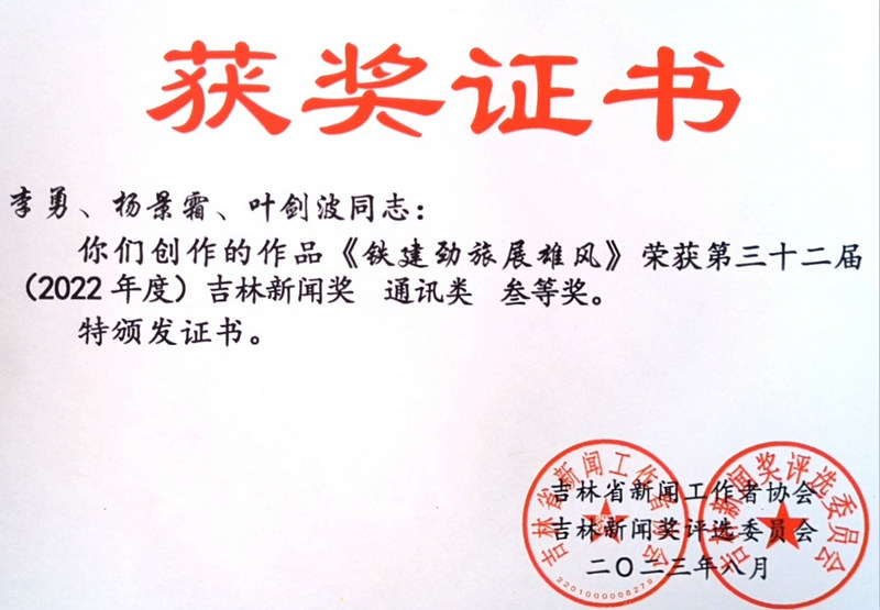 《鐵建勁旅展雄風》喜獲吉林省新聞獎