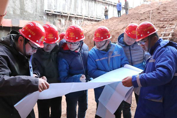 驗收人員在施工現(xiàn)場認真查看圖紙