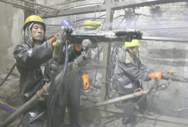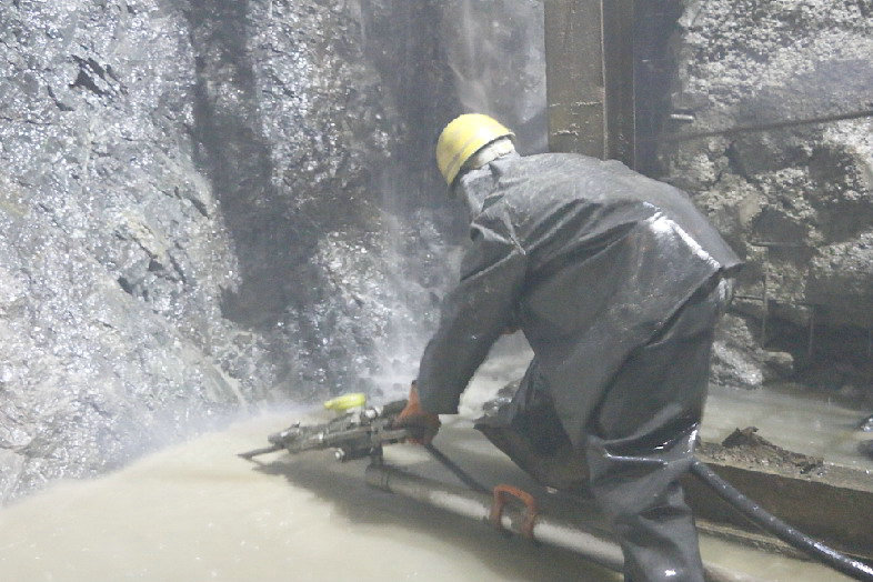 員工們在涌水嚴重的隧道掌子面積水中打風(fēng)鉆