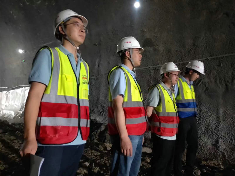 項(xiàng)目經(jīng)理阮超(左一)書記何偉(右二)帶隊(duì)中梁山隧道“夜查”
