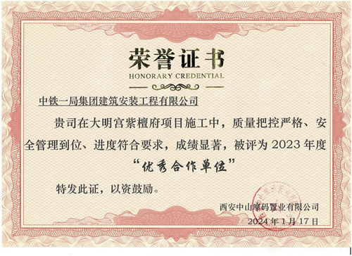1月28日,中鐵一局建安公司金源檀府項目部收到業(yè)主單位西安中山摩碼置業(yè)有限公司發(fā)來表揚信和榮譽證書,信中對項目部項目管理、工程進(jìn)度及安全質(zhì)量給予充分肯定。