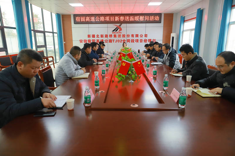 為關愛項目一線職工,公司工會以行動之“暖”、御嚴冬之“寒”。2月1日,北新路橋集團安徽宿固公司黨支部副書記、紀檢組組長、工會主席季慧博一行到安徽宿固高速公路TJ02合同段項目經(jīng)理部開展春節(jié)送溫暖慰問活動,為項目一線職工送去公司的關懷問候和新春祝福。宿固項目總監(jiān)辦、監(jiān)理駐地辦、土建2-6標負責人等20余人參加會議。