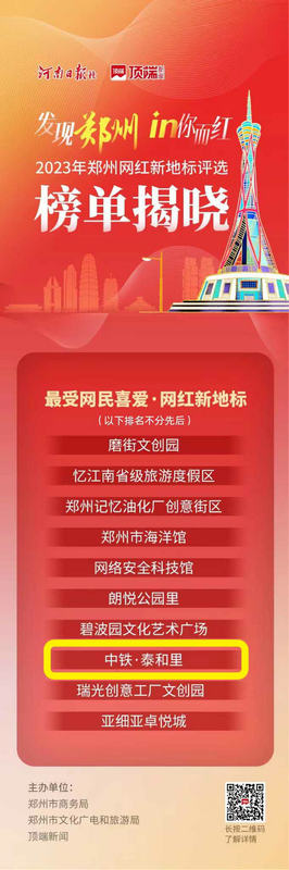 2024年1月,河南日?qǐng)?bào)社·頂端新聞聯(lián)合鄭州市商務(wù)局、鄭州市文化廣電和旅游局等部門(mén)聯(lián)合發(fā)起了“發(fā)現(xiàn)鄭州·2023鄭州網(wǎng)紅新地標(biāo)”網(wǎng)上征集評(píng)選活動(dòng),累計(jì)投票數(shù)達(dá)50萬(wàn)+,掀起了全民參與投票的活動(dòng)熱潮。中產(chǎn)置業(yè)公司中鐵·泰和里承辦了本次活動(dòng)線下頒獎(jiǎng)儀式,頒獎(jiǎng)儀式發(fā)布了“最受網(wǎng)民喜愛(ài)·網(wǎng)紅新地標(biāo)”“雙十佳人文景點(diǎn)·網(wǎng)紅新地標(biāo)”“十佳自然景觀·網(wǎng)紅新地標(biāo)”“十佳街區(qū)商業(yè)·網(wǎng)紅新地標(biāo)”等50個(gè)“2023鄭州網(wǎng)紅新地標(biāo)”,中鐵·泰和里榮獲“最受網(wǎng)民喜愛(ài)·網(wǎng)紅新地標(biāo)”和“最佳組織獎(jiǎng)”。