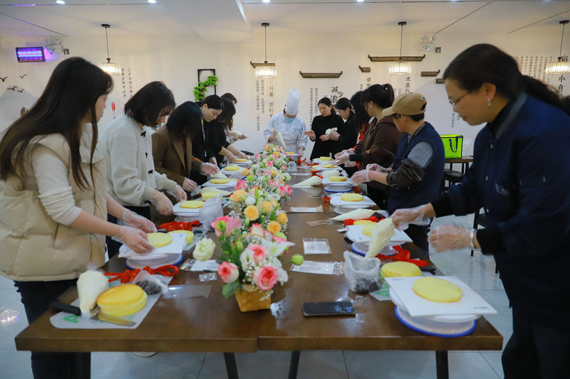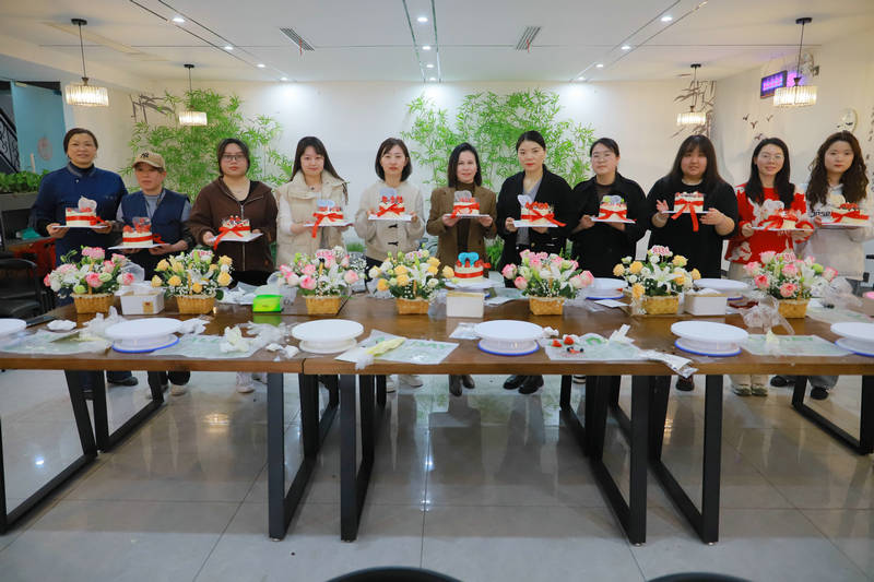 隨后,在專業(yè)烘焙老師的帶領(lǐng)下,大家?guī)狭耸痔?,聚精?huì)神地觀看老師的講解、制作和演示。從蛋糕胚的組合擺放,奶油的抹面,再到最后的造型裝飾,大家興致勃勃地動(dòng)起手化身美麗“廚娘”,現(xiàn)學(xué)現(xiàn)做,一雙雙靈巧的手制作出一個(gè)個(gè)獨(dú)具匠心的蛋糕,歡聲笑語和著蛋糕的香甜彌漫在整個(gè)制作室。