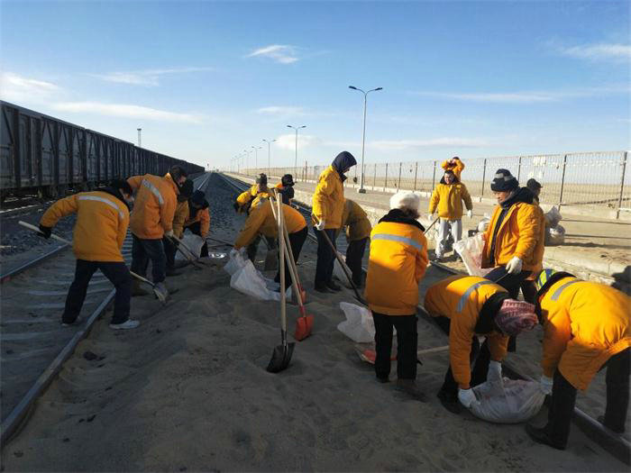 針對大風(fēng)天氣,維管段迅速啟動防風(fēng)應(yīng)急預(yù)案,下發(fā)預(yù)警通知,段領(lǐng)導(dǎo)干部下沉車間、班組,采取措施,制定方案,做好惡劣天氣下行車、人身、交通安全管控。維管段組織人員加密添乘巡檢頻次,加強對線路設(shè)備和防護柵欄的巡查,及時處理發(fā)現(xiàn)的安全隱患。段調(diào)度立即響應(yīng),采取措施,制定方案,確定有效處置方式。24日晚,段調(diào)度接到巡檢人員電話:“奎北線瑪納斯湖站內(nèi)股道出現(xiàn)積沙,沙借風(fēng)勢埋向鋼軌,嚴重侵襲線路”。段領(lǐng)導(dǎo)迅速組織機關(guān)、綜合機修車間47人趕赴現(xiàn)場救援,一場與“沙”的戰(zhàn)斗打響了!干部職工立即投入戰(zhàn)斗,拿鐵鍬的、拎袋子的、推架子車的、安全防護的……全體人員克服零下20度的嚴寒天氣與風(fēng)沙拼搏、與時間賽跑,經(jīng)過一個小時的埋頭苦干,鋼軌、軌枕上的積沙被清理干凈,線路露出了“真容”,該站迅速恢復(fù)了列車放行條件,清沙保衛(wèi)戰(zhàn)順利結(jié)束。