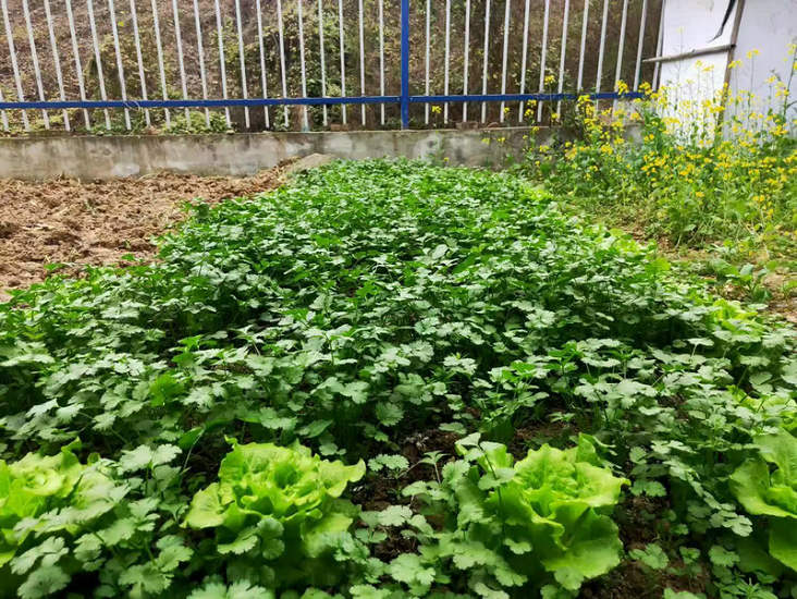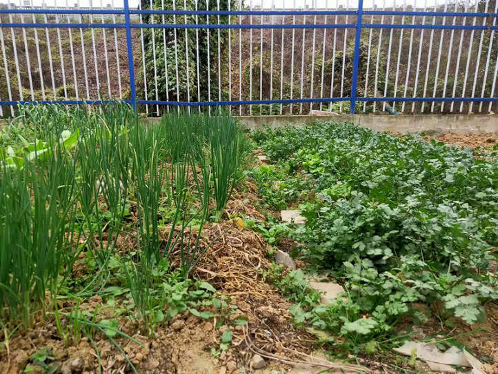 學雷鋒小菜園第二茬播撒的香菜還沒有吃完、第三茬長勢喜人