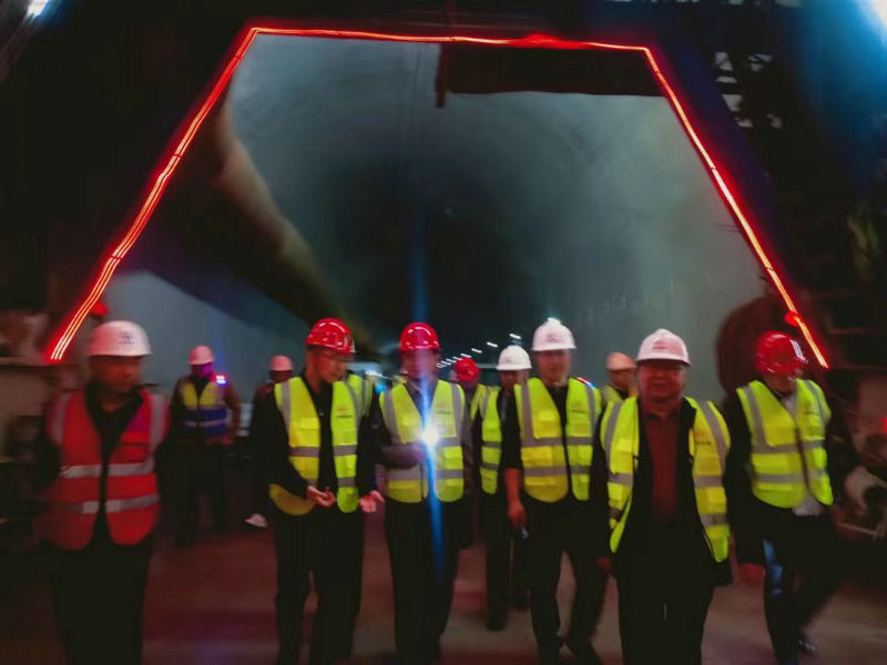 項(xiàng)目經(jīng)理阮超(右2)陪同劉偉(左1)在中梁山隧道進(jìn)口調(diào)研