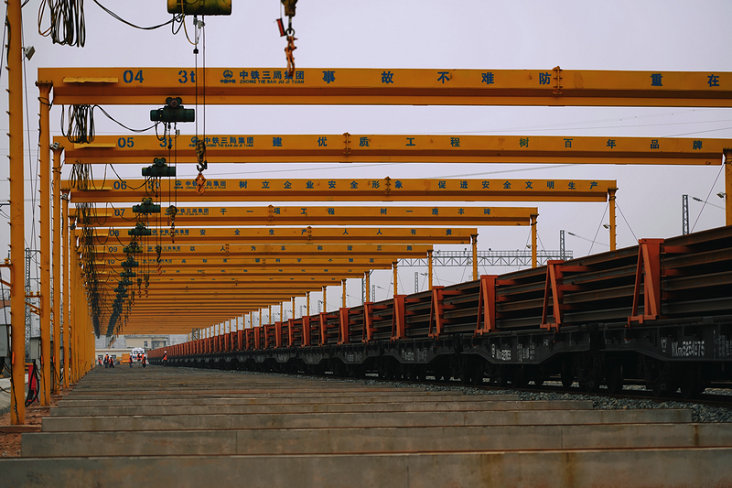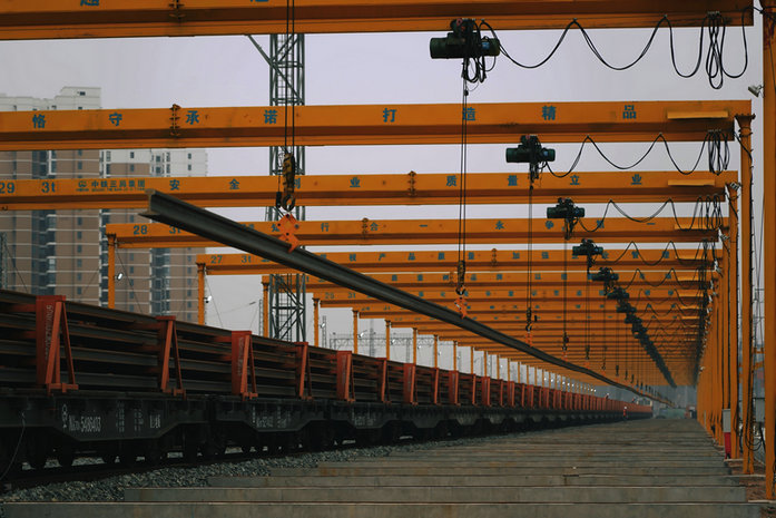 宜昌東鋪軌基地內(nèi)設(shè)置長(zhǎng)軌存放區(qū)1處,配置有32臺(tái)固定式群吊,最大存軌能力112.5公里。長(zhǎng)軌進(jìn)場(chǎng)標(biāo)志著宜興鐵路鋼軌的生產(chǎn)、焊接、運(yùn)輸渠道已順利打通。