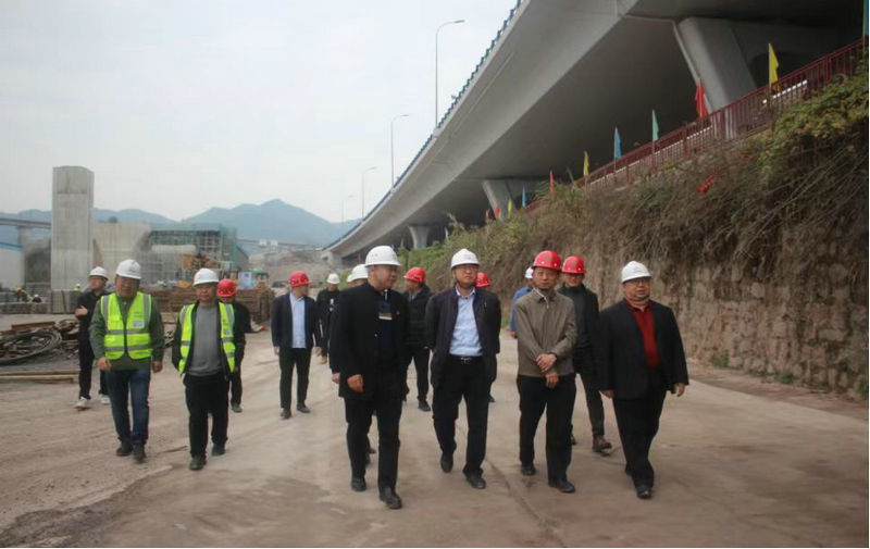 總承包部指揮長(zhǎng)李兵(右1)、黨工委書記王向平(右3)、副指揮長(zhǎng)陳華富(左2)在現(xiàn)場(chǎng)巡查