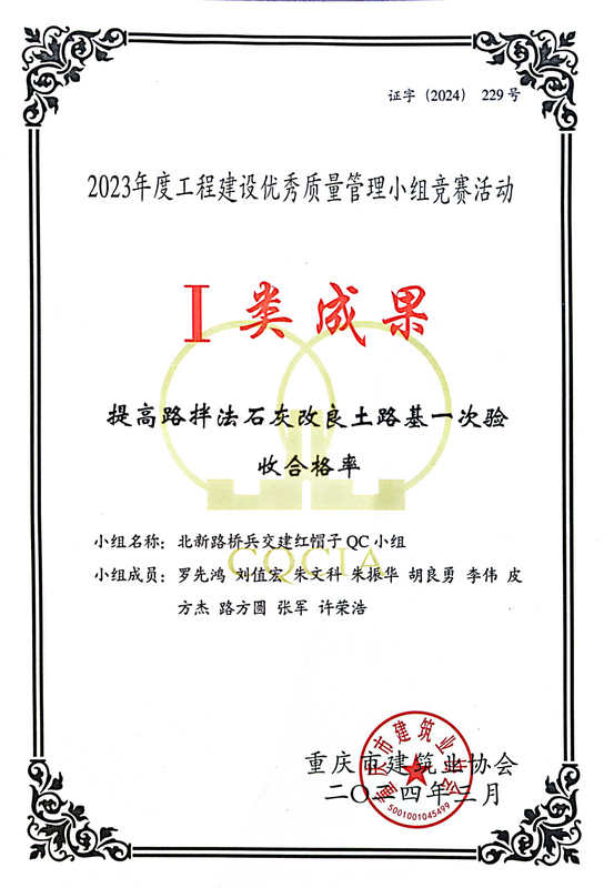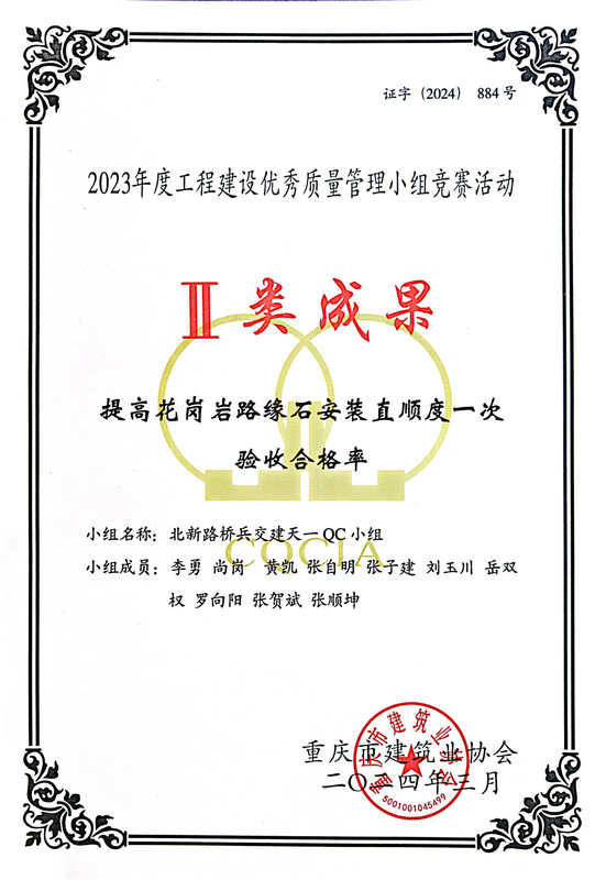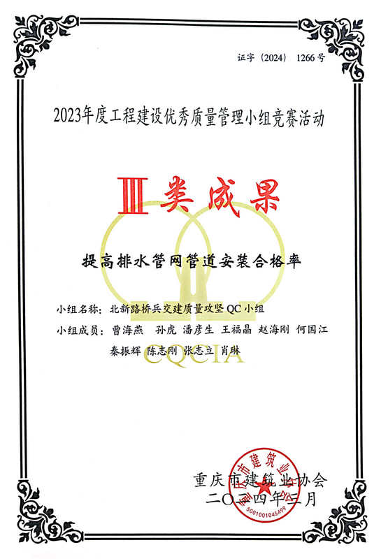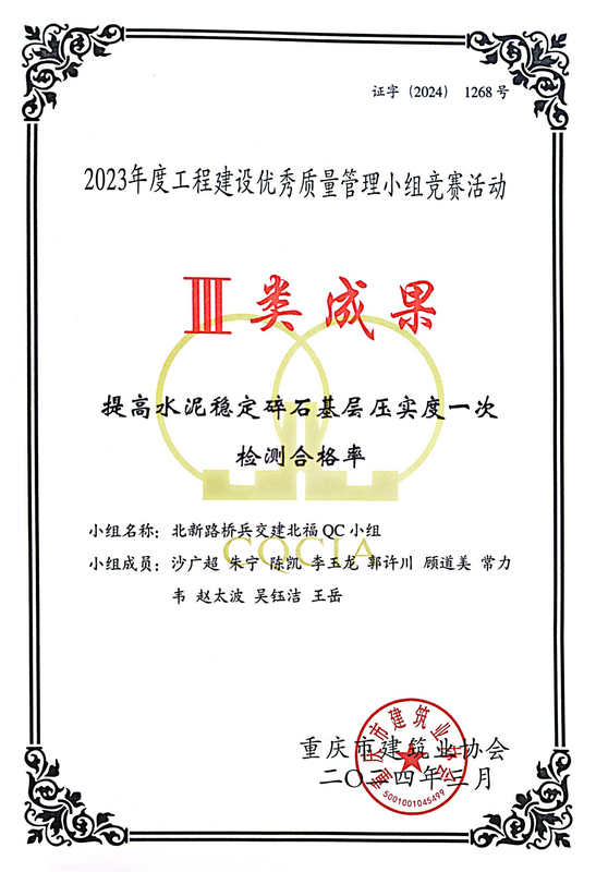 烏魯木齊訊(通訊員 許榮浩)近日,重慶市建筑業(yè)協(xié)會(huì)文件,關(guān)于通報(bào)重慶市建筑業(yè)協(xié)會(huì)2023年度工程建設(shè)優(yōu)秀質(zhì)量管理小組結(jié)果的決定,兵團(tuán)交通建設(shè)有限公司榮獲一類成果1項(xiàng)、二類成果3項(xiàng)、三類成果6項(xiàng)。