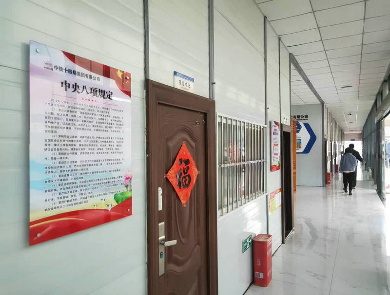 項目部黨政主管門口張貼著“中央八項規(guī)定”、“中國共產(chǎn)黨廉潔自律準(zhǔn)則”等有關(guān)警示標(biāo)牌,起到居安思危、警鐘長鳴的警示作用