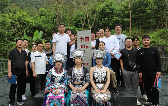 職工們漫步在曲曲彎彎的景觀道上,神清氣爽,相互交流著對(duì)瀑布的形狀和氣勢(shì),驚嘆于大自然的神來之筆,你一言我一語,發(fā)揮各自豐富的想象力,并與瀑布合影留念,表達(dá)對(duì)大自然的熱愛。從瀑布到界碑處,都留下難忘的記憶。旅游是快樂的,也是辛苦的,在通往山頂?shù)氖A上,走走停停,不時(shí)回望來時(shí)的路和欣賞身后的美景。由于與越南交界,大家把目光專住地投向?qū)γ嬖侥系纳剿谰?,有的說跟中國(guó)的山水沒啥區(qū)別,有的說,還是中國(guó)廣西的山水好,中國(guó)改革開放幾十年來變化太大了。有的職工聯(lián)想到企業(yè)的發(fā)展,認(rèn)為趕上好時(shí)代了,沒有企業(yè)的發(fā)展,就沒有如今職工豐厚的待遇。
