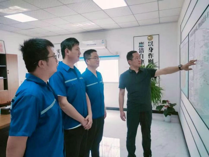 項目經(jīng)理阮超(右1)與總工程師李文慶(右2)技術(shù)人員在研究技術(shù)創(chuàng)新發(fā)展計劃