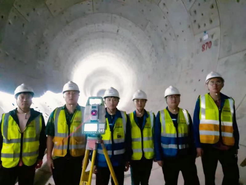 測量隊張有江部長(右2)在TBM盾構(gòu)左線區(qū)間進(jìn)行測量技術(shù)傳幫帶