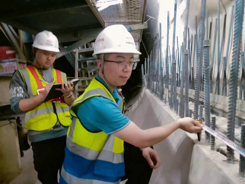 李飛(右)在中梁山隧道進口進行二襯鋼筋間距檢查