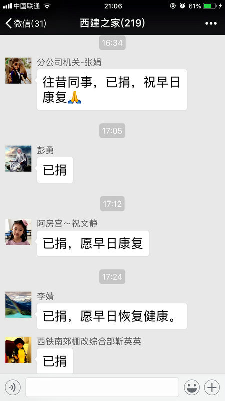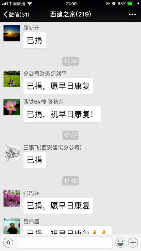 一人有難,眾人幫。西安建筑分公司員工自發(fā)把捐款打到叱干元博同事“水滴籌”的賬戶上,并通過微信轉發(fā)“水滴籌”讓愛心繼續(xù)傳遞擴散,希望看到的朋友能夠紛紛伸出援助之手,幫助叱干元博早日康復。
