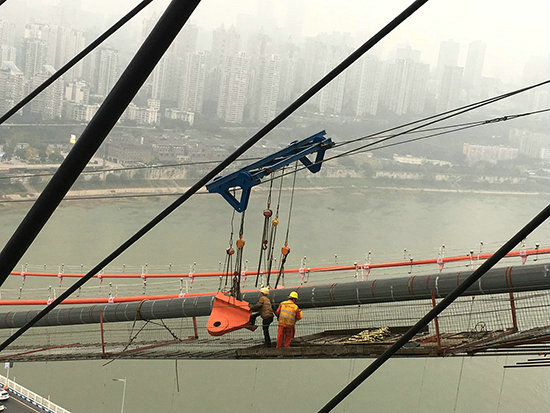 11月30日,中鐵建大橋工程局一公司承建的鵝公巖軌道專用橋工程順利完成索夾安裝施工,具備吊桿安裝條件。