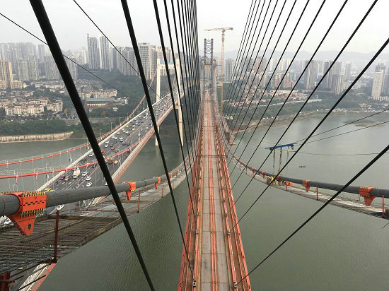 重慶鵝公巖軌道專用橋跨越長江,全長1650.5米,主橋長1120米,塔身含臨時索塔高達197.28米,主跨600米,屬于雙塔雙索面、五跨鋼箱梁自錨式懸索橋,其跨徑之大為同類型橋梁的世界之最。大橋在柔性體系上將進行“先斜拉、后懸索”的施工體系轉(zhuǎn)換,在國內(nèi)外尚屬首列。大橋已合龍形成斜拉橋體系,后續(xù)在主纜索上安裝索夾、吊桿后,開始“斜拉——懸索”的體系轉(zhuǎn)換施工,最后,按照從上到下的順序拆除16對斜拉索和臨時塔柱,實現(xiàn)懸索橋成橋。