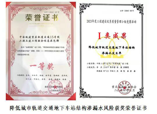 五一前夕,從重慶市市政工程協(xié)會(huì)、建筑業(yè)協(xié)會(huì)傳來喜報(bào),中鐵建重慶軌道交通15號(hào)線二期總承包部質(zhì)量管理小組成果榮獲5項(xiàng)獎(jiǎng)勵(lì),其中“降低城市軌道交通地下車站結(jié)構(gòu)滲漏水風(fēng)險(xiǎn)”課題,榮獲2024年度重慶市市政行業(yè)優(yōu)秀質(zhì)量管理小組一等獎(jiǎng),重慶市2023年度工程建設(shè)優(yōu)秀質(zhì)量管理小組競(jìng)賽活動(dòng)1類成果,并被推薦到全國建筑業(yè)協(xié)會(huì)參加優(yōu)秀質(zhì)量管理小組評(píng)選。----中鐵建重慶軌道15號(hào)線總承包部QC小組成果榮獲重慶市5項(xiàng)獎(jiǎng)勵(lì)