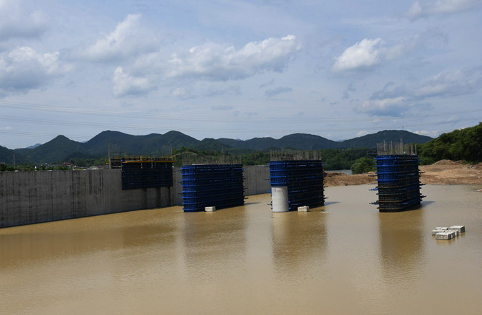 汛期過后,根據(jù)總體設(shè)計(jì)方案,再筑圍堰,除完工的混凝土導(dǎo)流墻可做一部分圍堰外,在倒流墻兩側(cè)再填筑部分堤壩,屆時(shí)將恢復(fù)4個(gè)泄洪閘墩上部結(jié)構(gòu)施工。
