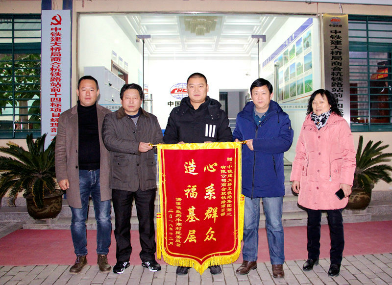 12月14日,馬鞍山市含山縣清溪鎮(zhèn)人大主席周大寶及半湖村書記王文革將印有“心系群眾 造?;鶎?rdquo;的錦旗贈予中國鐵建大橋工程局集團(tuán)三公司商合杭鐵路項目部,表達(dá)了對項目的感激之情,展現(xiàn)了項目與地方百姓“路地攜手,和諧共建”的友誼。