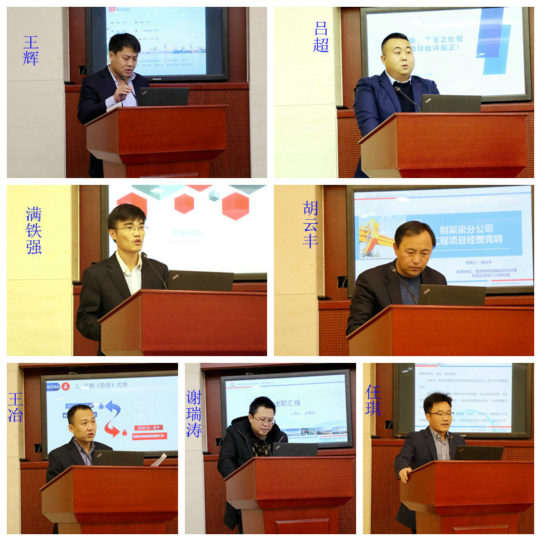 此次從初評(píng)中脫穎而出參加競(jìng)聘大會(huì)的7名同志分別是王輝、呂超、滿鐵強(qiáng)、胡云峰、王冶、謝瑞濤、任琪。他們目前都是各自項(xiàng)目的班子成員,在生產(chǎn)副經(jīng)理、總工程師、制梁場(chǎng)場(chǎng)長(zhǎng)等崗位任職。“我競(jìng)聘的優(yōu)勢(shì)是……”“如果我競(jìng)聘成功,我的工作思路是這樣的……”他們分別從任職履歷、工作經(jīng)驗(yàn)、工作思路和規(guī)劃等方面進(jìn)行競(jìng)聘闡述。每名競(jìng)聘者闡述完畢后在座評(píng)委針對(duì)人員管理、隊(duì)伍管理等具體問題進(jìn)行提問,由競(jìng)聘者予以作答。