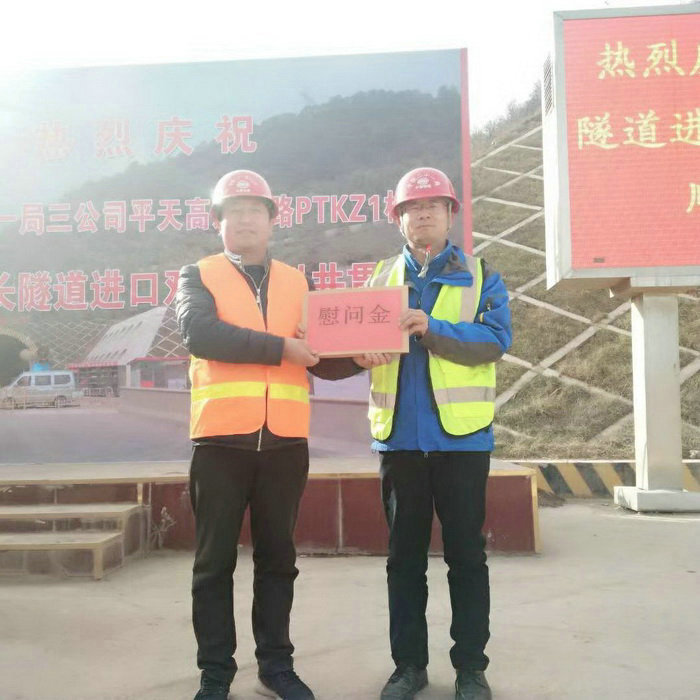 項目常務(wù)副經(jīng)理兼總工程師柳吉煥為施工隊負責(zé)人發(fā)放慰問金 為攻克關(guān)山隧道施工難關(guān),在強化組織管理,優(yōu)配施工資源,著力現(xiàn)場安全質(zhì)量管控的同時,大力開展技術(shù)創(chuàng)新,在施工中采用了一系列新技術(shù)、新工藝、新設(shè)備,如采用大管棚配合三臺階七步法順利下穿304省道、推廣應(yīng)用何廣沂教授研發(fā)的“新型聚能水壓光面爆破新技術(shù)”、邀請公司“創(chuàng)新專家”馬小利成功研發(fā)“小導(dǎo)管縮尖機”、引進防水板自動鋪設(shè)臺車、霧炮養(yǎng)生機、自行式液壓仰拱棧橋、單臂鑿巖臺車、單臂濕噴機等先進設(shè)備,克服地質(zhì)復(fù)雜、極端天氣影響、地材短缺等困難,科學(xué)組織,精心施工,為創(chuàng)建平安工地,打造品質(zhì)工程發(fā)揮了重要作用。