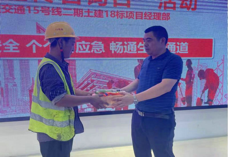 18標(biāo)項(xiàng)目部開展安全有獎(jiǎng)問(wèn)答活動(dòng),項(xiàng)目書記李均強(qiáng)(右)為員工發(fā)獎(jiǎng)品