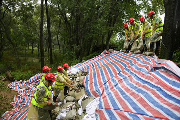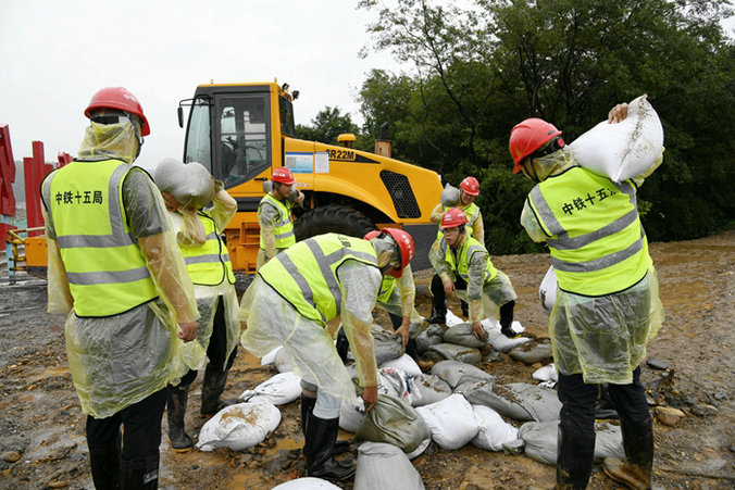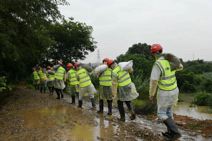 他們分工明確,搶險救援有條不紊地進行。為了古縣畈村群眾的安全,搶險隊員忠實履行央企社會責任,在雨水里扛運、堆碼,與自卸車、挖掘機展開人機接力賽。轉(zhuǎn)運沙袋的員工盡管穿著雨衣、半高腰雨鞋,雨水仍然從臉上灌進里面,衣服都被澆濕了,雨鞋里灌滿了泥水,在泥濘不堪的小路上來回穿梭,全然不顧這些,只為了盡快將堤壩筑牢。