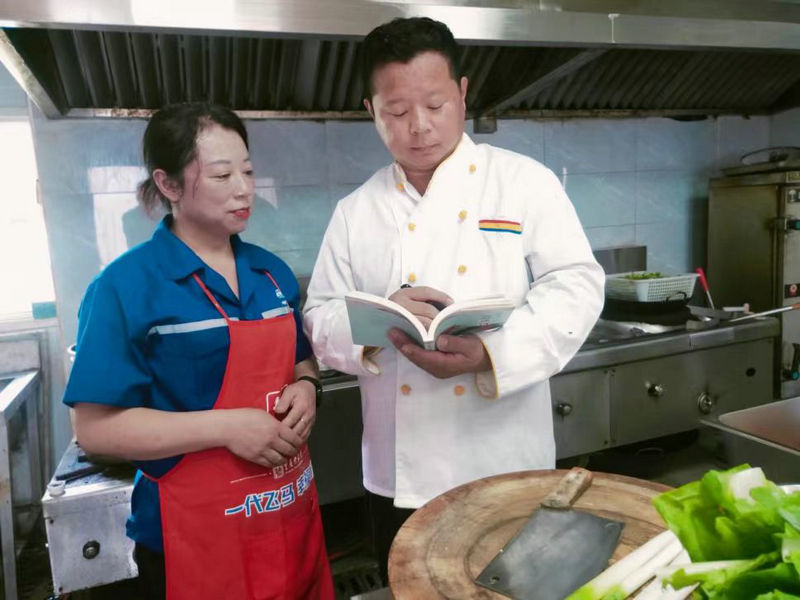 廚師田慶雷和面點(diǎn)師江偉麗看著“菜譜”為員工調(diào)劑伙食