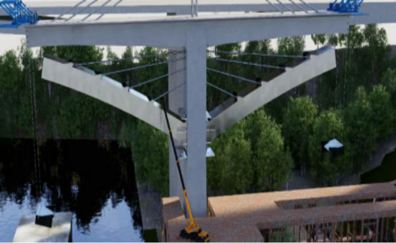 廖家溪軌道專用橋,橋梁全長804.9m,跨嘉陵江,與禮嘉嘉陵江大橋?qū)撞贾?,橋面寬度?3.6m。是全線的重難點、關(guān)鍵控制性工程,鋼結(jié)構(gòu)分塊數(shù)量多,安裝焊接精度高,工程施工難度大。尤其主墩三角區(qū)是目前國內(nèi)軌道交通中首例鋼斜撐空腹連續(xù)剛構(gòu)橋主要部位,關(guān)鍵工序,空間環(huán)境特殊,工藝復雜。隨著P11#塊主梁施工的完成,橋梁建設(shè)進入了至關(guān)重要的階段。P11#塊與C11鋼斜撐段的緊密空間,原設(shè)計的掛籃因無法適應(yīng)這一特殊環(huán)境,無法有效起吊C11#鋼斜撐。當鋼斜撐與主梁交匯時,形成了一個獨特的空間結(jié)構(gòu),如何保障橋梁的穩(wěn)定性和安全性等難題,給施工帶來了很大困難和挑戰(zhàn)。項目部運用BIM技術(shù),通過精準的建模和細致的分析,讓施工人員了解施工工藝,并結(jié)合BIM模型制作了施工工藝視頻詳解,通過生動直觀的方式,詳細展示了施工過程的每一環(huán)節(jié),包括材料的選擇、施工的順序、技術(shù)的要點等,使施工人員了解施工要求,明確施工工藝,保證了施工有序安全優(yōu)質(zhì)高效推進,三角區(qū)順利合龍,為大橋全面合龍建成打下了堅實基礎(chǔ)。 ( 林赤喜 羅長林)