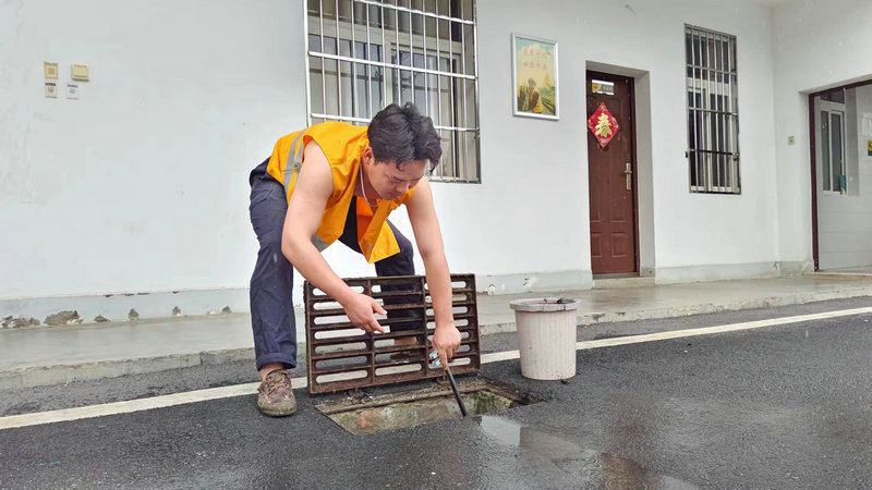 2024年7月27日,王寨示范隊(duì)職工縱衡在清理院內(nèi)下水道雜物。