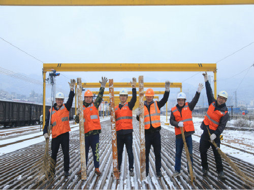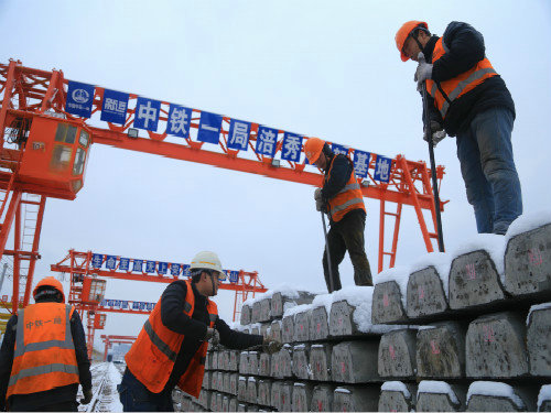 晚上19時,筆者來到了項目在建的鋪架基地,借著既有線站臺的燈光放眼望去,我看到了一幅幅熱火朝天的施工圖景。機車拉著轟鳴的汽笛有序地將車體送進既定線路,鏟車伴著紛飛的雪花不停地舞動著臂膀,在大燈的照耀下,施工人員忙碌的身影愈顯的更加真實。