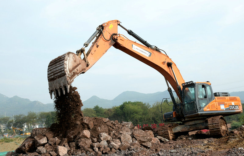 挖掘機作業(yè) 孫永現(xiàn)攝白虎灘樞紐位于常山縣樊溪村上游200米處,主要工程量為1座電站,15孔14米寬、7米高泄洪閘、應急過船設施、船閘、主副廠房等。因項目一半建在常山江河道上,必須先進行圍堰施工,待圍堰具備抵擋洪水沖擊能力,樞紐各分項工程方可進入施工程序。另外,常山江每年4—7月份為每年的主汛期,暴雨和上游20多座水庫泄洪導致常山江水流暴漲、湍急,最大洪峰水位將升高6—8米,座落在江水中的泄洪閘、船閘等必須停工給洪水讓路,汛期過后再復工,與其它3座樞紐情況一樣。