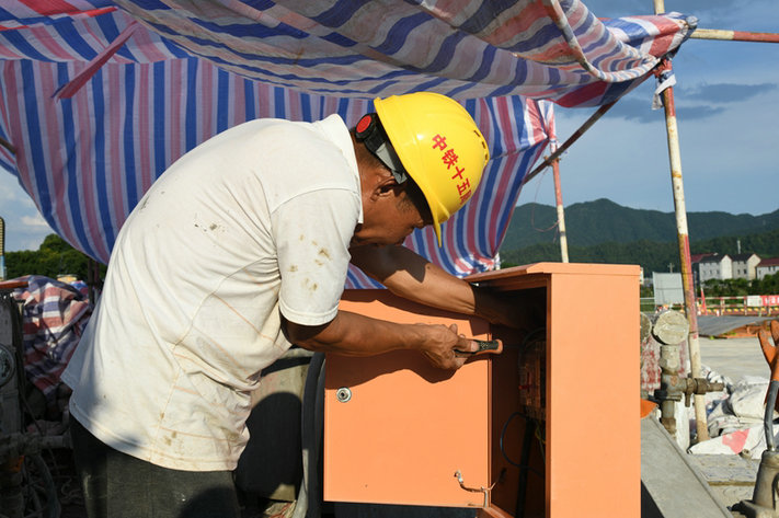 電工在烈日下汗流滿面 贠煥軍攝