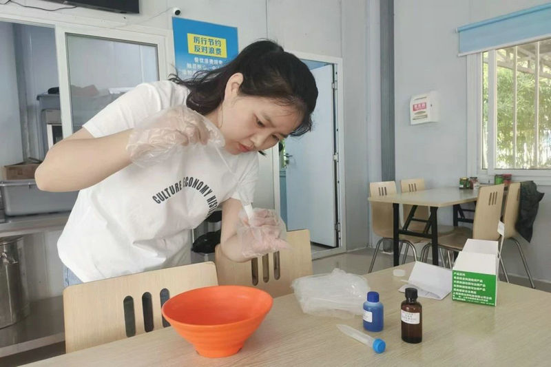 夏秋季節(jié)天氣炎熱,蚊蠅繁殖快,給職工健康帶來(lái)一定危害。為保證食堂餐具、職工碗筷干凈衛(wèi)生,項(xiàng)目綜合辦公室人員根據(jù)主管領(lǐng)導(dǎo)安排,按照餐飲衛(wèi)生標(biāo)準(zhǔn),選用一款既經(jīng)濟(jì)又高效快捷的檢測(cè)試劑對(duì)餐具、碗筷進(jìn)行衛(wèi)生檢測(cè),該試劑能在3-5分鐘內(nèi)快速檢測(cè)出餐具表面清潔是否合格,陰離子合成洗滌劑的殘留量是否超標(biāo)。同時(shí),將所有餐具進(jìn)行集中殺菌消毒,讓職工放心地就餐。