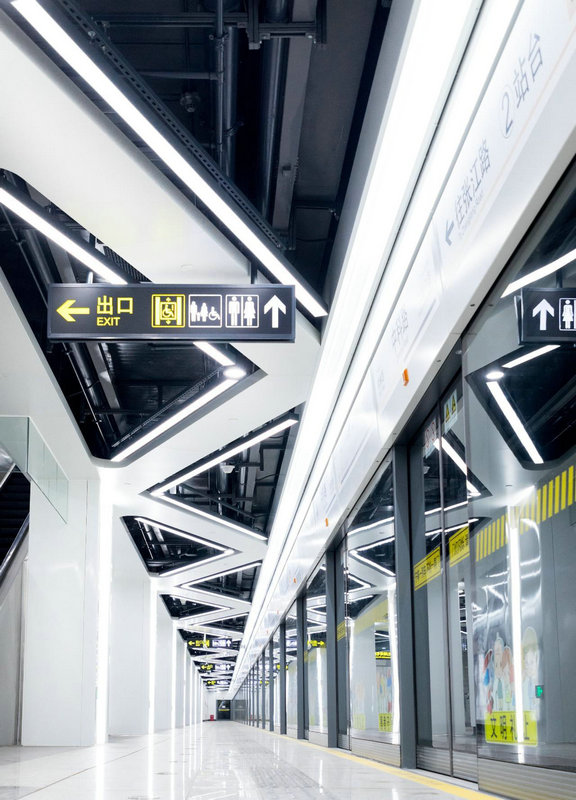 作為張江科技城的門(mén)戶(hù)車(chē)站,中科路站的裝修理念也是極具時(shí)代氣息。鏡面不銹鋼構(gòu)成的石墨晶體結(jié)構(gòu)吊頂,地面上鋪滿(mǎn)黑白相間的幾何圖形,站廳中央的巨幅LED大屏實(shí)時(shí)展示地鐵建設(shè)運(yùn)營(yíng)的最新動(dòng)態(tài),機(jī)電設(shè)備房裝修與色彩交相呼應(yīng)。