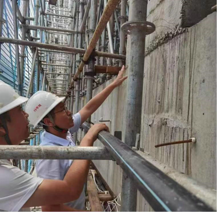 總承包部副指揮長兼總工程師楊振(右1)在現(xiàn)場檢查